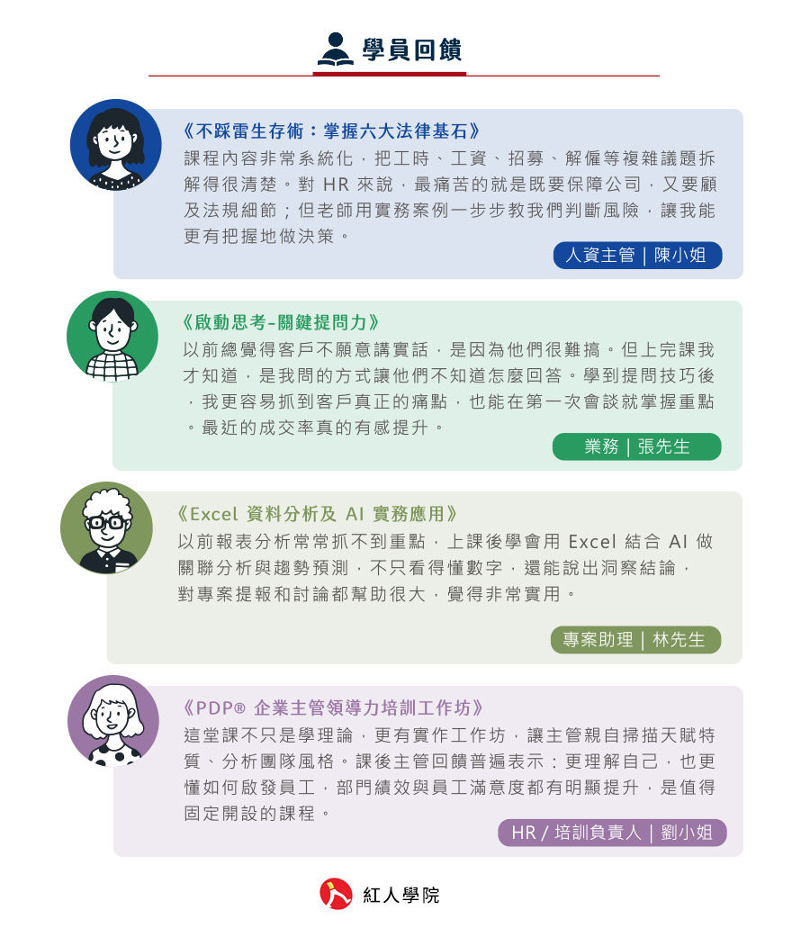 從HR 招募、法令、職場溝通、AI應用課程到進階的領導管理、跨文化團隊協作一應俱全。